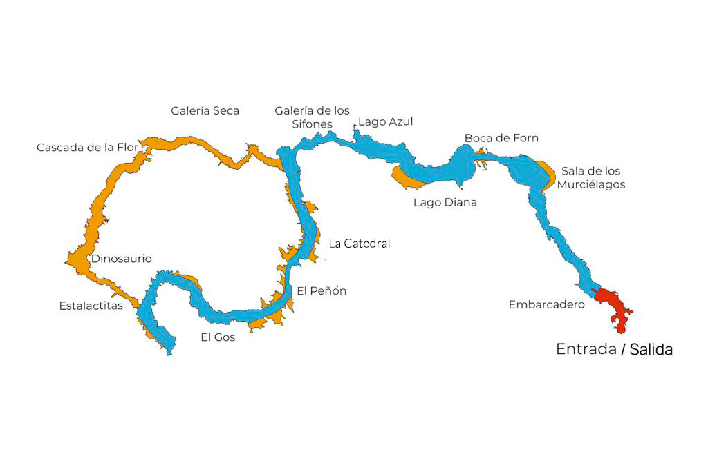 Durante aproximadamente 40 minutos, el visitante explora un mundo de estalactitas y estalagmitas en un recorrido de 1.050 metros. La travesía tiene dos tramos: 800 metros en barca por aguas cristalinas y 250 metros a pie, siempre que las condiciones lo permitan, en las que el visitante estará guiado en todo momento por nuestro personal para no perder ningún detalle.